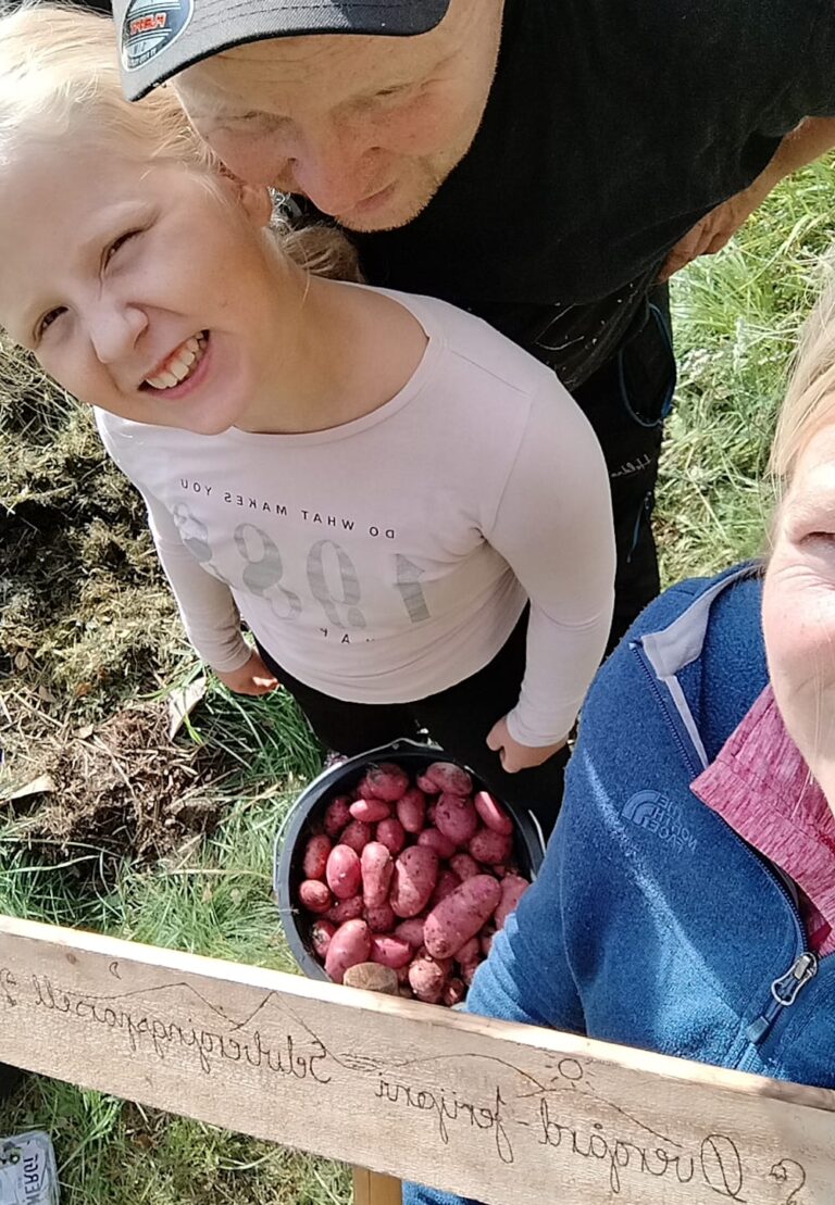 Familien Marte Øvergård og Geir Jerijærvi synes det har vært artig med parsellhage. Nå har de vært med på felles innhøsting.